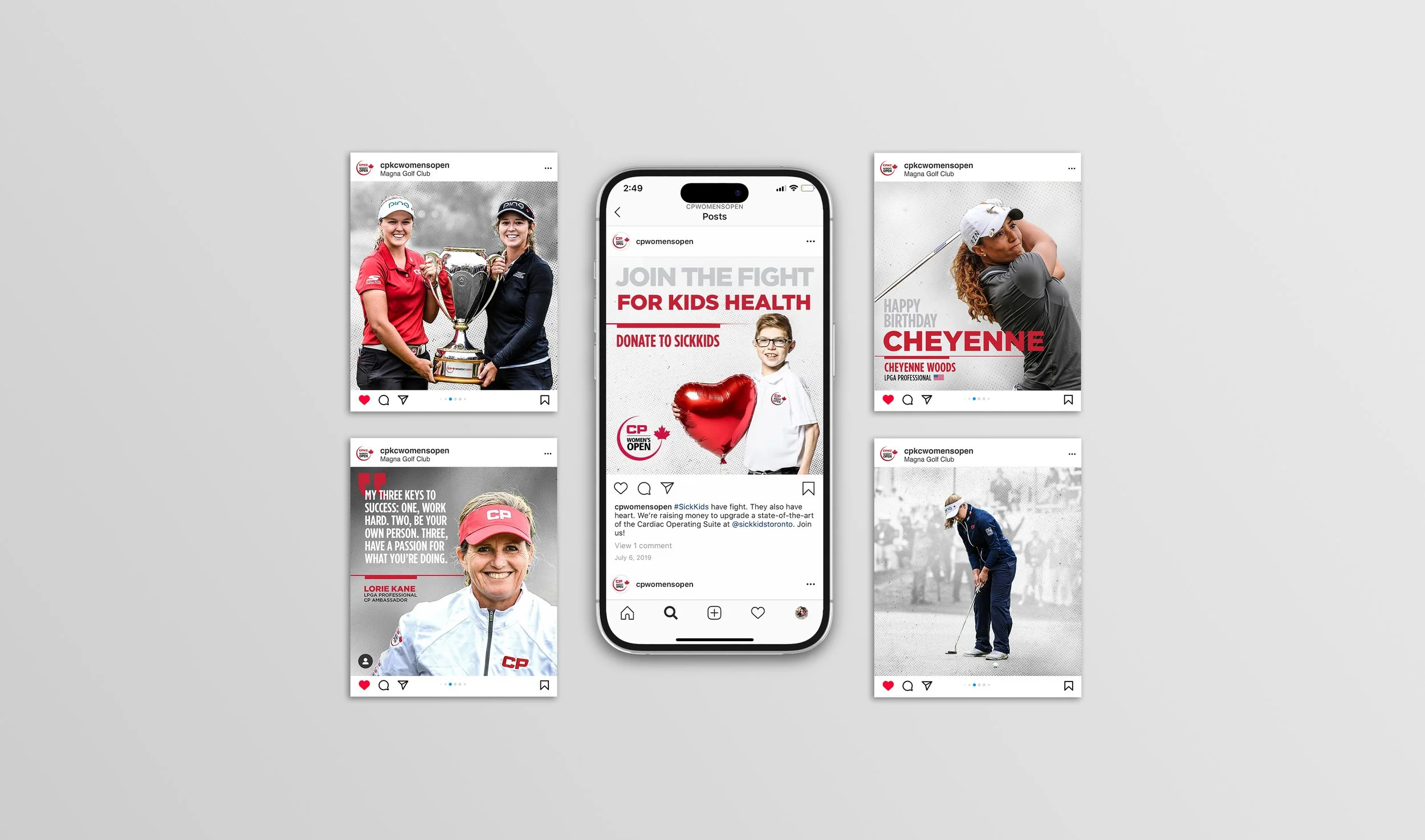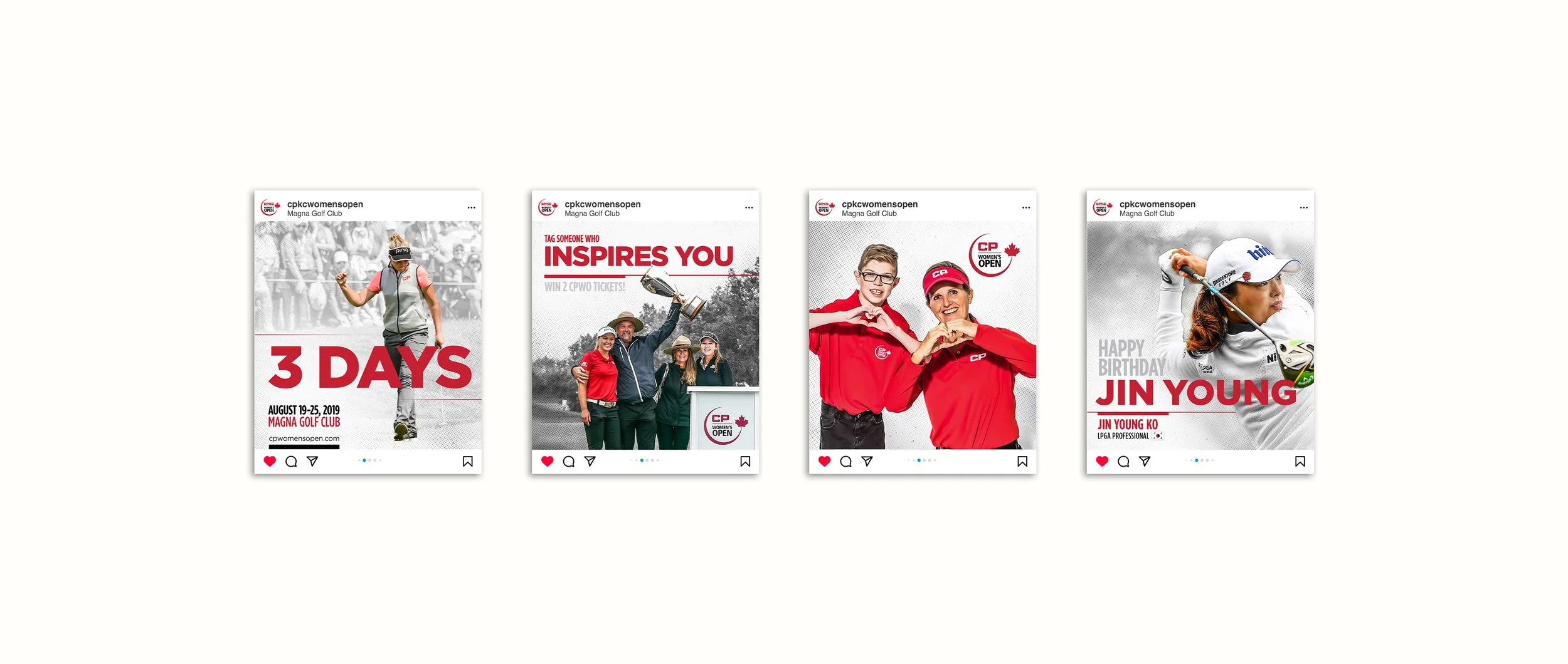 Social media graphics for the Canadian Women’s Open golf tournament, adhering to brand guidelines and working with provided photography. The project required translating well established brand elements into dynamic digital content for tournament promotion across various social platforms.