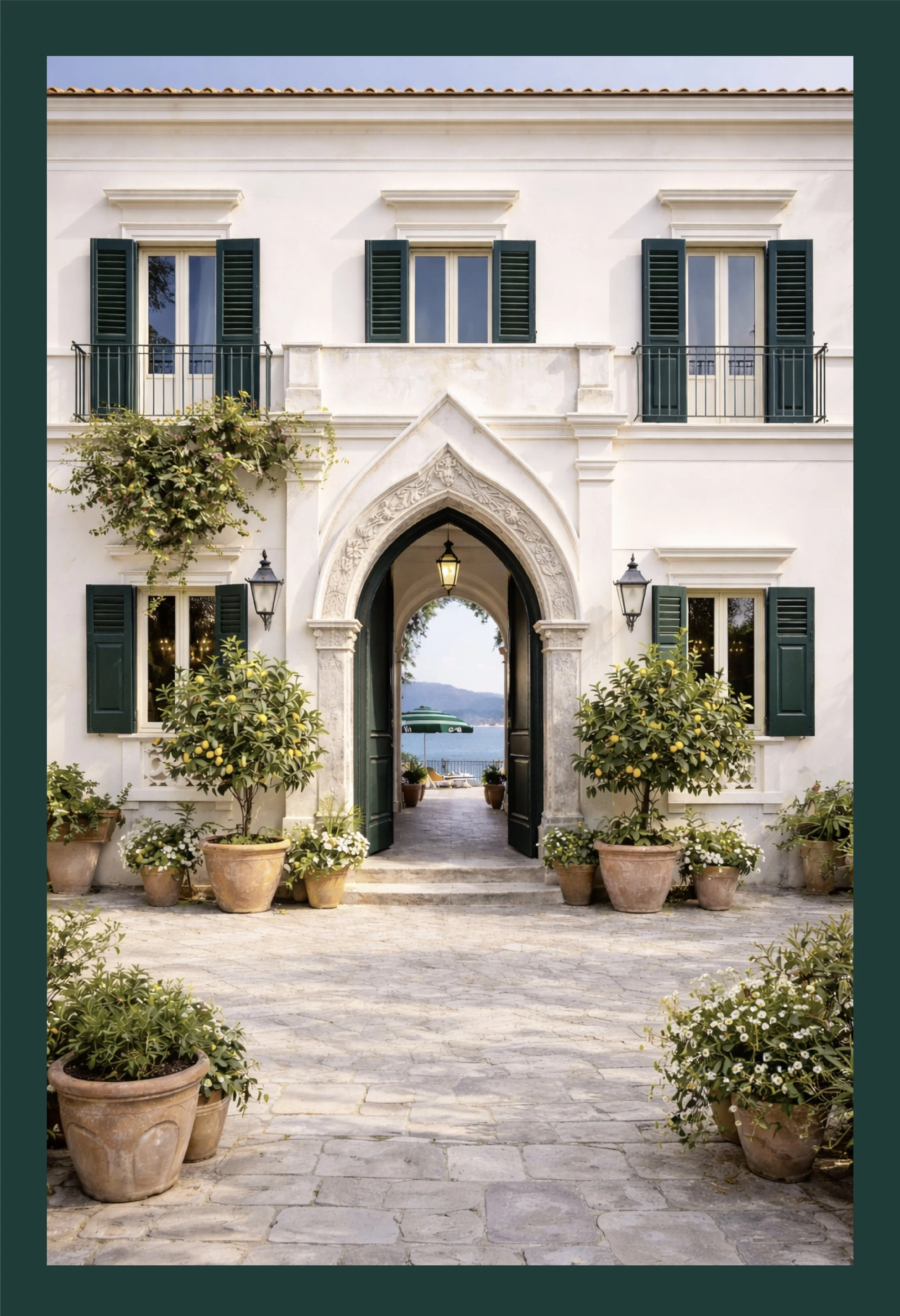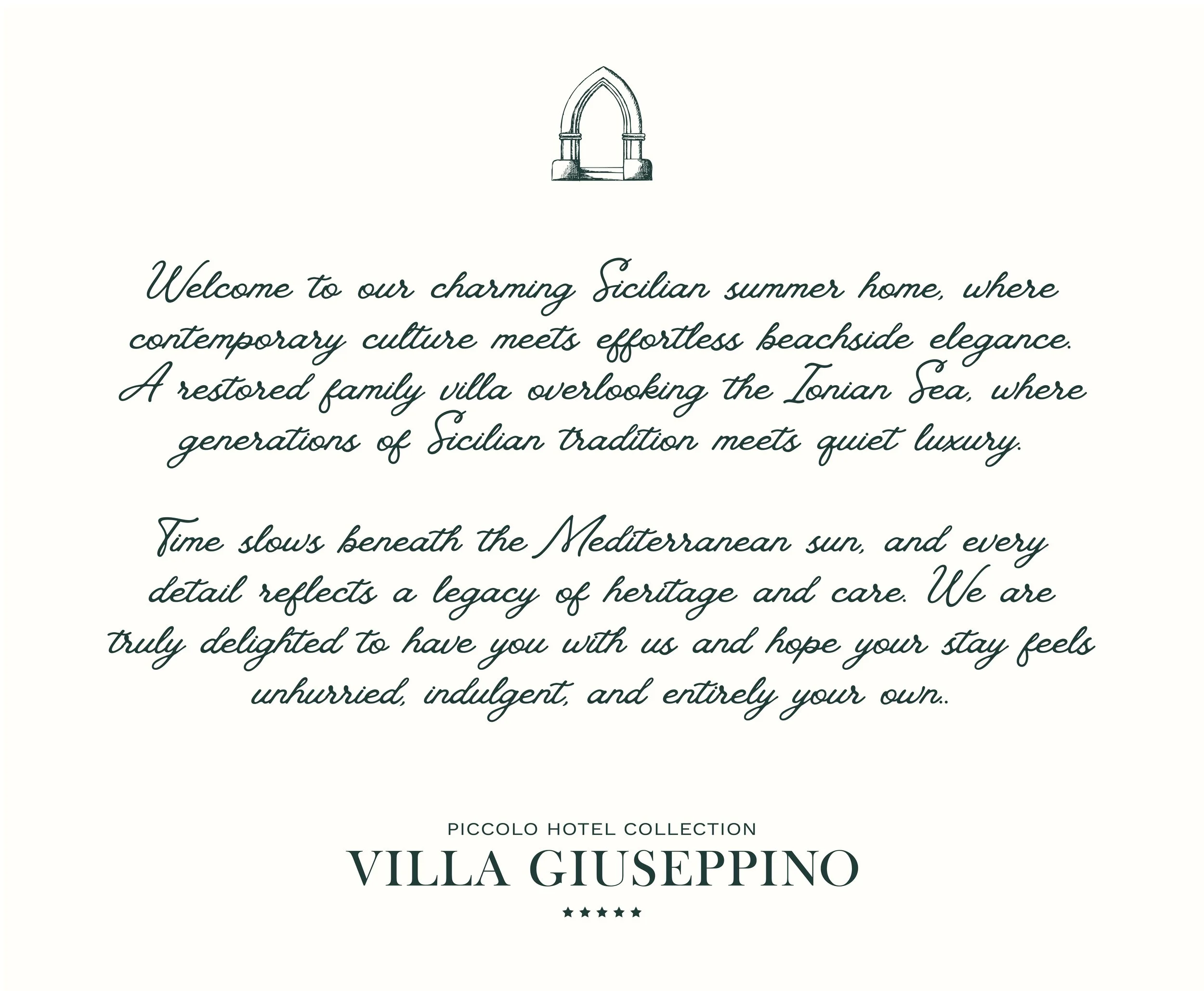 The work focused on developing a cohesive brand identity, including a custom logo and visual direction supported by curated moodboards. The logo mark draws inspiration from traditional Sicilian archways, creating a timeless symbol that reflects the architectural character of the villa. A palette of deep Mediterranean green and soft neutral tones was selected to evoke heritage, warmth, and quiet luxury.
