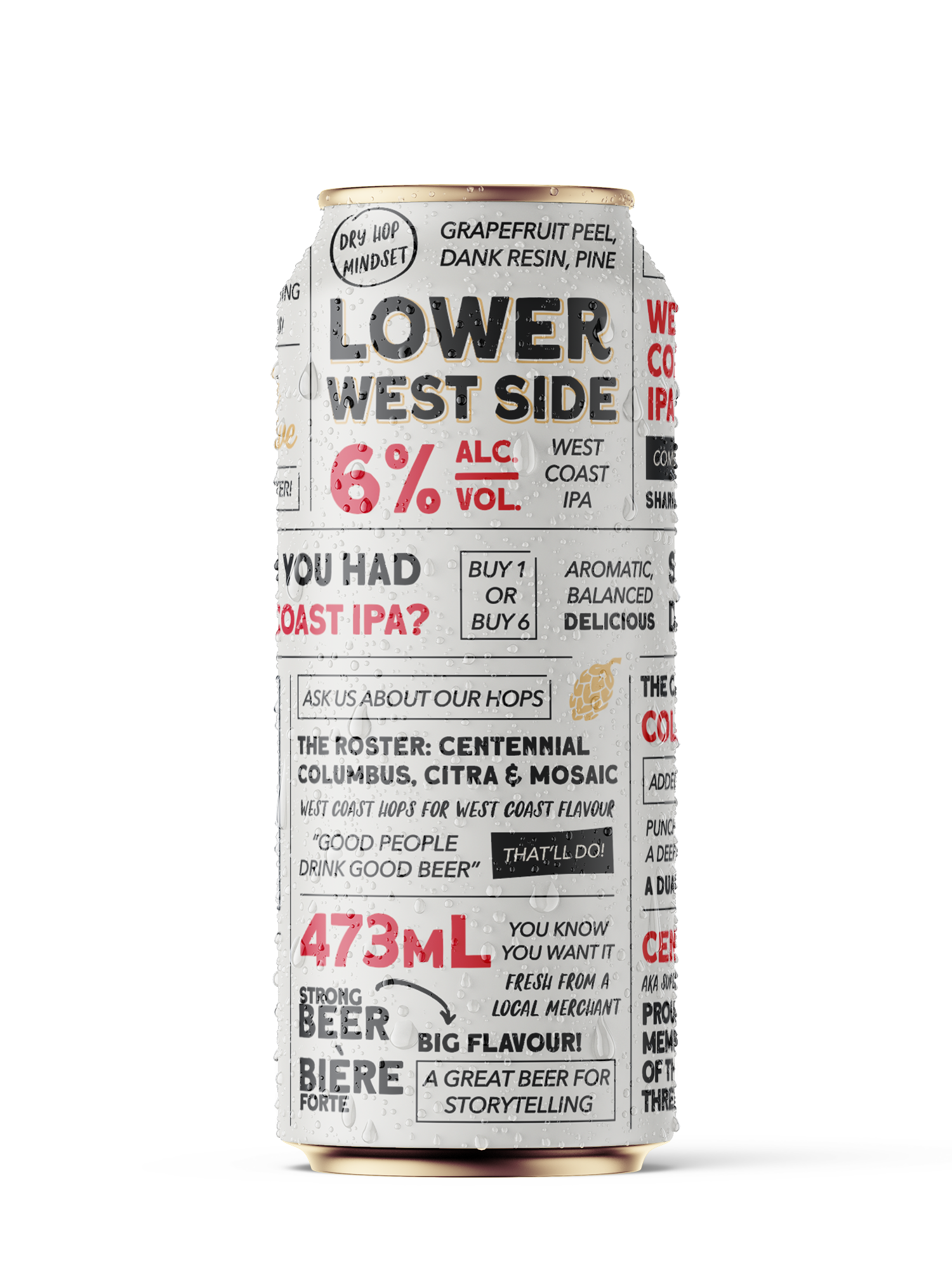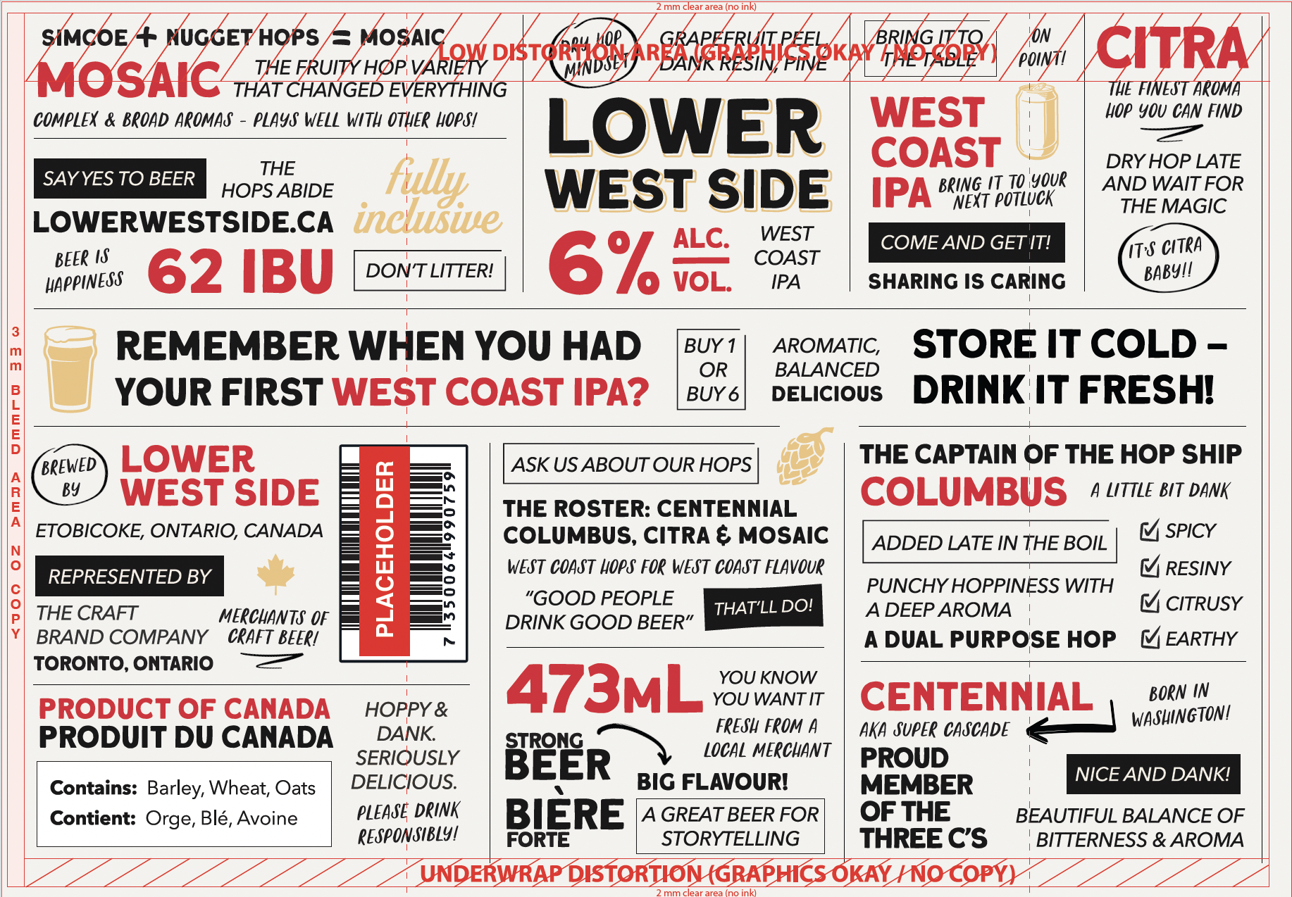 Building on this foundation, I designed the beer packaging for their West Coast IPA, including can artwork and retail tray graphics, ensuring strong shelf presence while maintaining brand consistency across both formats. The final packaging was successfully approved for distribution through the LCBO, demonstrating both creative impact and compliance with regulated retail requirements.